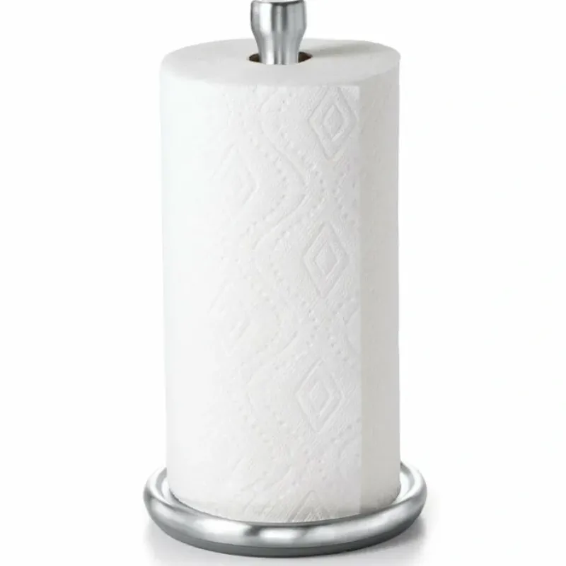 The OXO Good Grips paper towel holder clears countertop space and makes paper towels more accessible than ever. The smooth rotation allows for easy. one-handed ripping. and the knob is designed to keep even large rolls in place. The angle of the base makes installation easy and the die-cast bracket and knob will never rust. and you can install it in walls or under cabinets. Steady mounted paper towel holder clears countertop space and makes paper towels more accessible than ever. Comes in gray/silver color. The smooth rotation allows for easy. one-handed ripping. The knob is designed to keep even large rolls in place.