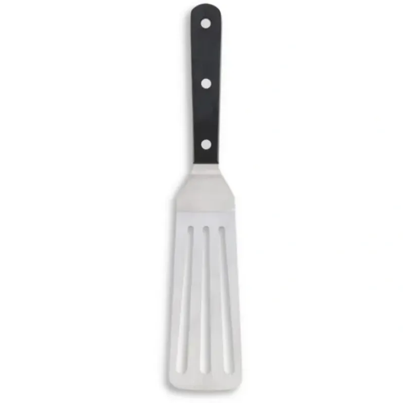 - Cutlery-Pro’s Narrow Triple-Rivet Slotted Turner with long. angled blade lifts. flips. folds. drains. and serves foods