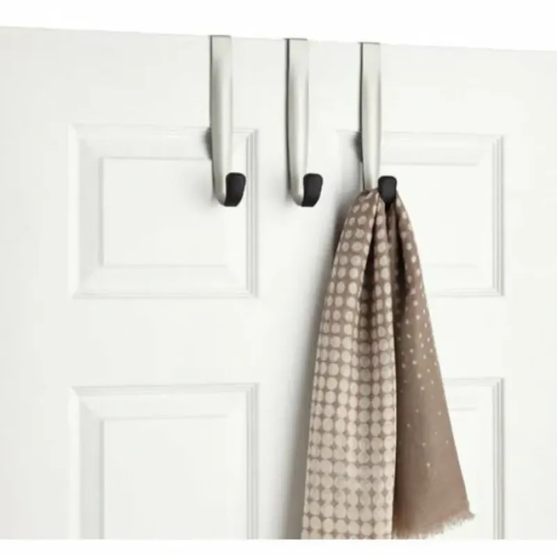 Schnook is a sleek and modern over-the-door hook made of stamped metal in a sleek nickel finish. Both ends of the Schnook have protective black rubber. The rubber on the over the door hook serves as a bumper for your door. which also prevents the hook from sliding. The end of the hook where you hang your clothes has rubber to protect your clothes from snagging or slipping. Each hook holds up to 5 lbs.