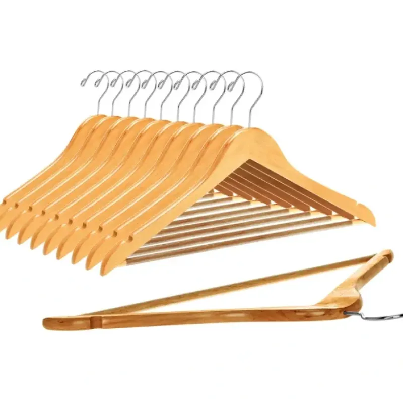 W030 Semi Curved Wooden Hanger. 17.5″ Natural with Chrome hooks Each pack comes with 5 hangers