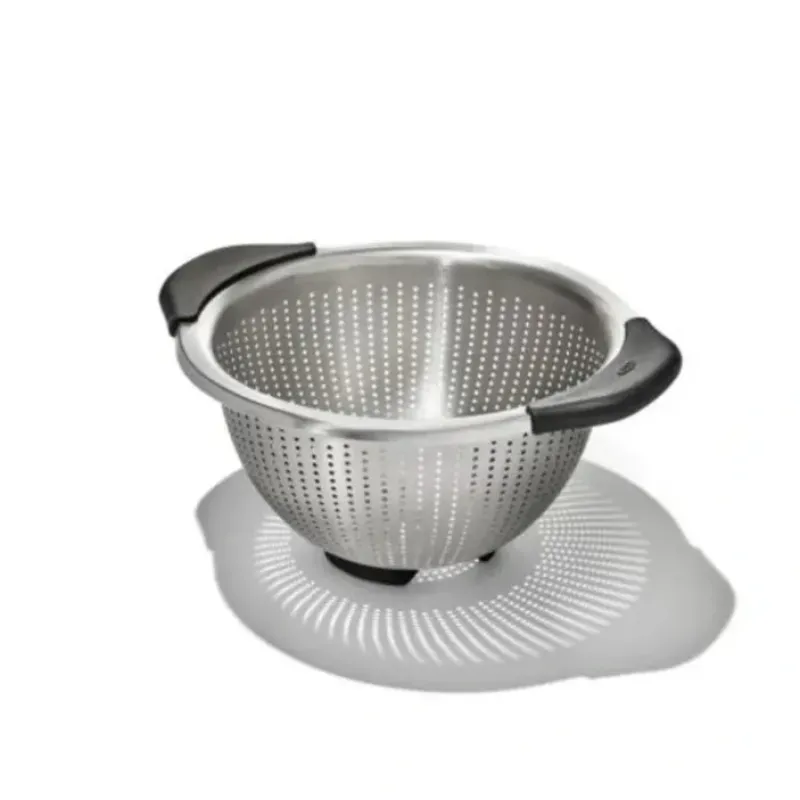 Whether you’re rinsing veggies or straining pasta. the OXO Good Grips 3-Qt Stainless Steel Colander is ready for the job. Elevated. non-slip handles provide a firm and comfortable grip. even when handling large batches. Our Colander is constructed with three feet at the base that deliver stability in the sink and on the countertop and nest neatly in our Stainless Steel Mixing Bowls for convenient straining and storage. The perforated design ensures fast and thorough straining. Also available in 5-qt size.