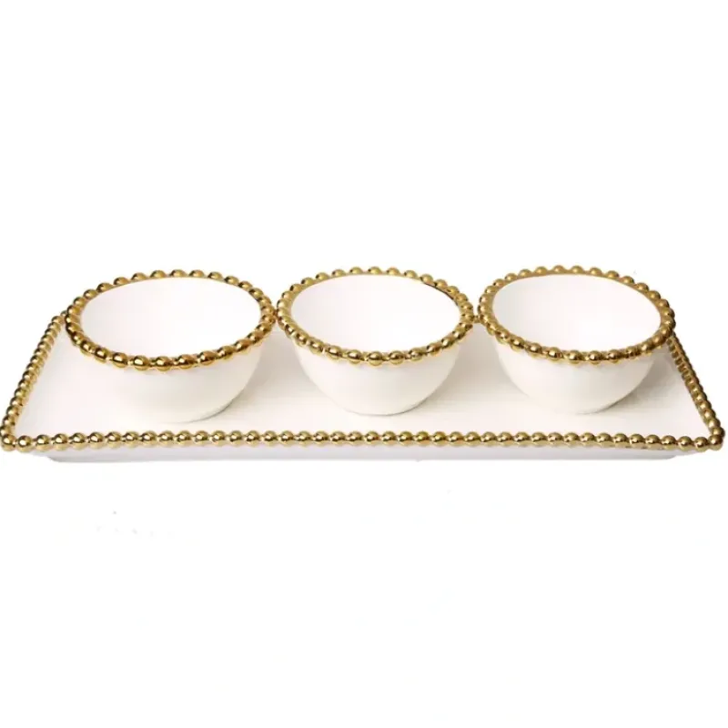 O4965217WPR520 Porcelain White relish dish with 3 round bowls with Gold Beaded Design-m 14.5″L x 6″W x 3″H