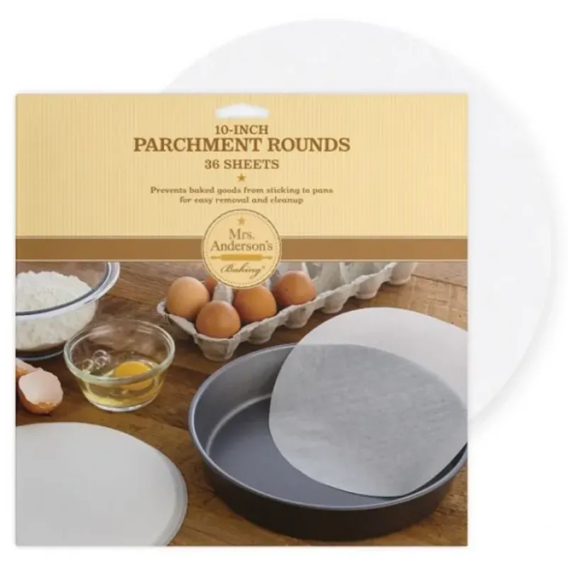 - Mrs. Anderson’s Non-Stick Parchment Cake Rounds keep baked goods from sticking without greasing baking pans or the use of oils