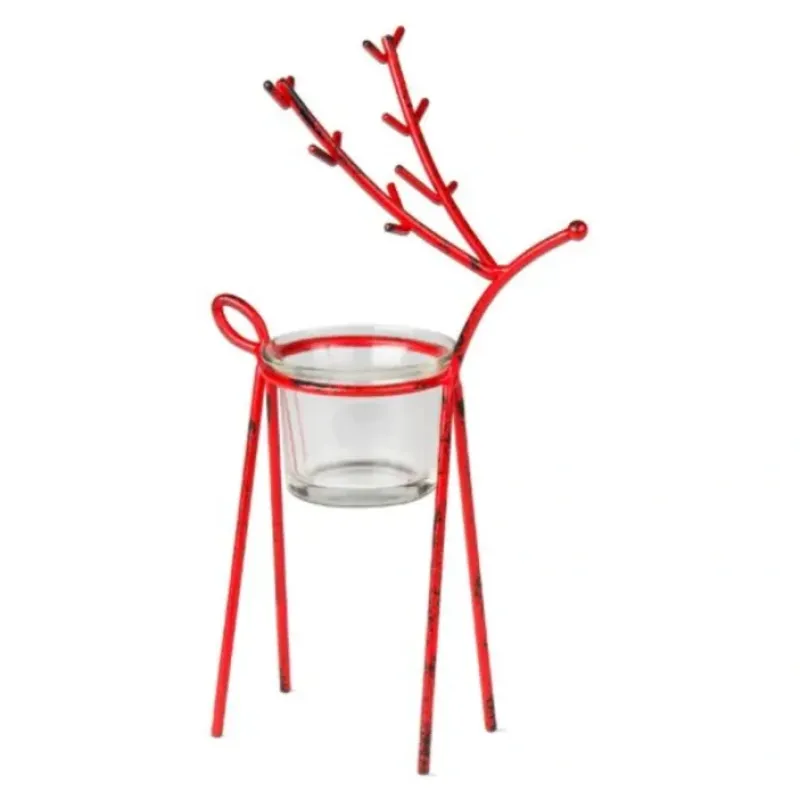 And then they lived happily ever antler! set the holiday scene with our reindeer tea light holder. the perfect addition to your christmas tablescapes. made from metal in a classic red finish. holds a standard or led tea light candle. sold separately.