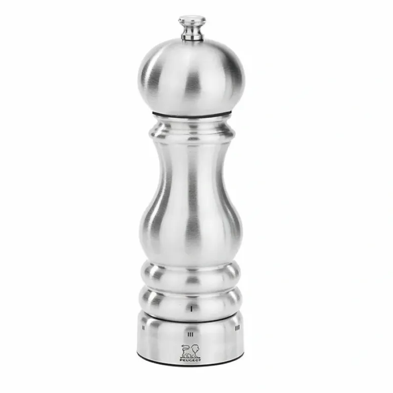 Brushed stainless steel finish. Peugeot Mills are partially filled with pepper at the factory in France as part of final assembly and testing. The pepper mechanism is equipped with a helix-shaped double row of teeth that guide and hold the peppercorns for a perfect grind. It has a patented treatment that protects the steel from corrosion while maintaining its sharpness and wear resistance. Releases maximum flavor and aroma by first cracking each peppercorn before it is ground. Grinds evenly from powder fine to very coarse thanks to the u’s elect adjustment ring that offers six pre-defined settings and more in between.Country of Origin: FranceAssembled Dimensions5.3 x 5.3 x 7.5 inchesMaterialStainless SteelCapacity4 OunceCare InstructionHand Wash