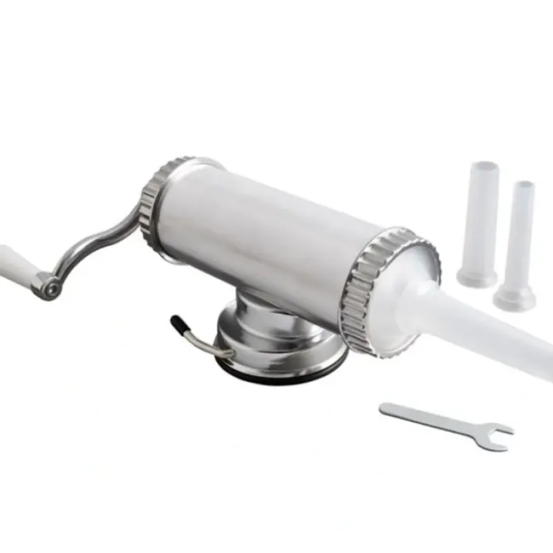 - Fill canister with sausage meat. slide casing onto the nozzle and turn handle to fill; guide casing by hand to prevent breakage; tie at desired length