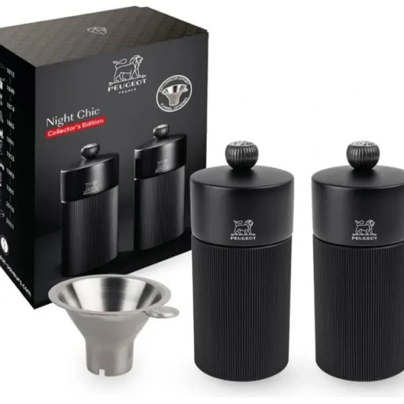 - Set includes Line salt and pepper mills in intense matte black finish. sachet of dry salt and pepper sachet. and stainless steel funnel for refilling ease. All in gift box