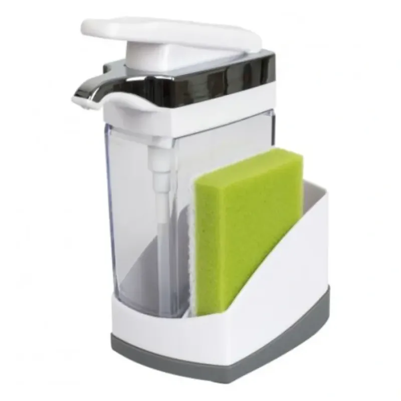 Soap dispenser and a compartment for sponge or dish brush (which are not included).