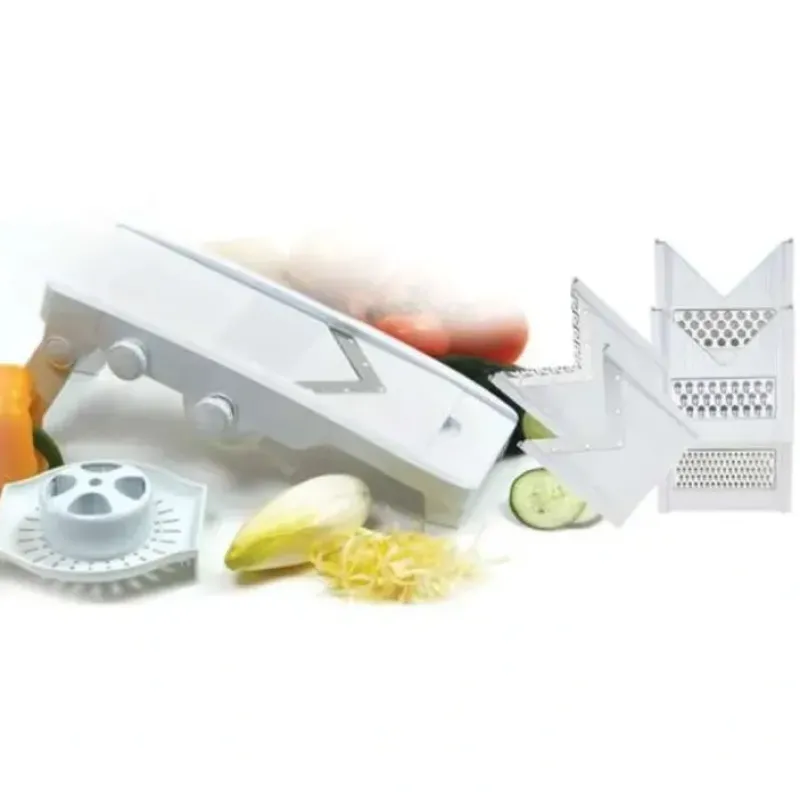Five stainless steel blades for fine and coarse grating or shredding. 1-9mm slicing. including wavy cuts. 6mm or 9mm french fry/julienne cuts.