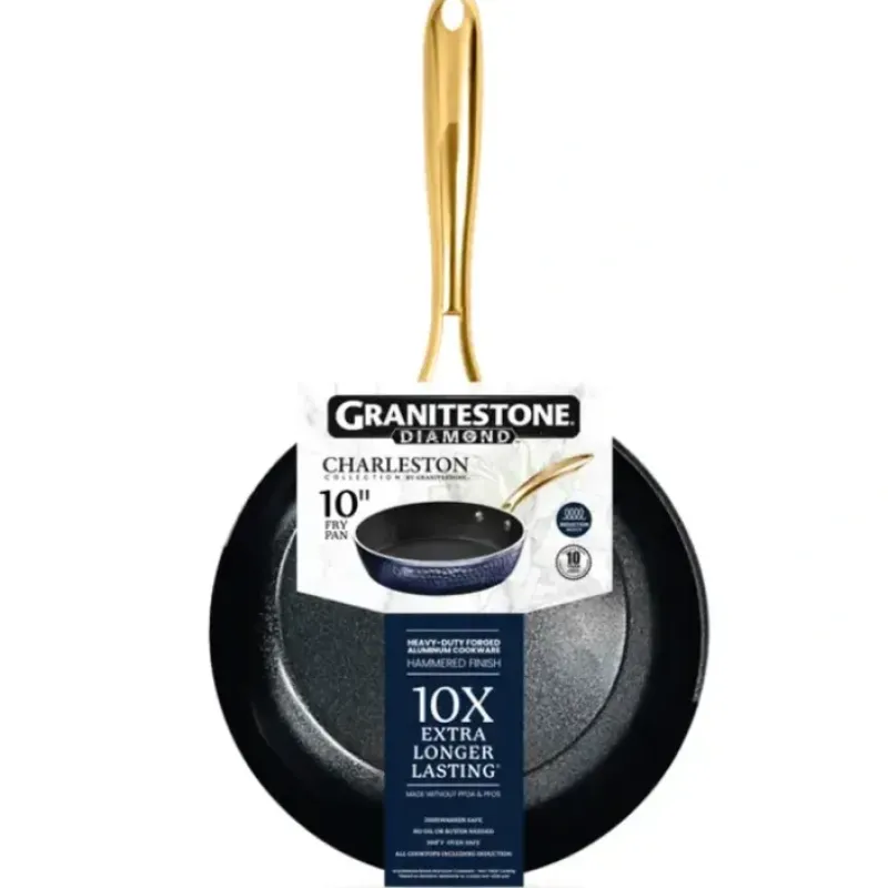 Granitestone Diamond Charleston Collection (Navy) 10″ Round Fry Pan.Charleston collection – drawing inspiration from southern living. this cookware melds timeless elegance with modern functionality. Not only does it suit both contemporary and traditional kitchens with its universal charm. but it also offers exceptional nonstick performance and unparalleled functionality.10 Inch fry pan: a nonstick coating with even heat distribution is ideal for cooking eggs. searing salmon. stir frying veggies. and more!Ultra nonstick surface: easy on. easy off with an interior that prevents food from sticking. Little to no oil or butter is needed to cook. plus it’s made without pfoa. pfos. lead. or cadmium so it’s healthier for you and your family.