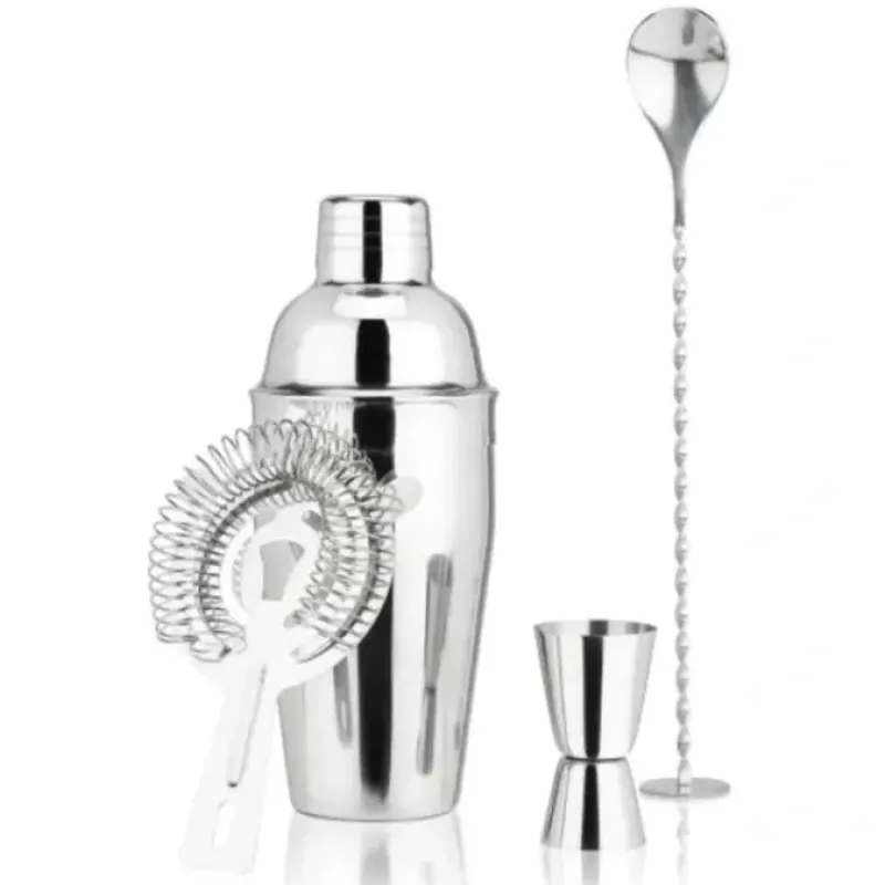 - 4 piece set (includes shaker. spoon. jigger. and strainer)