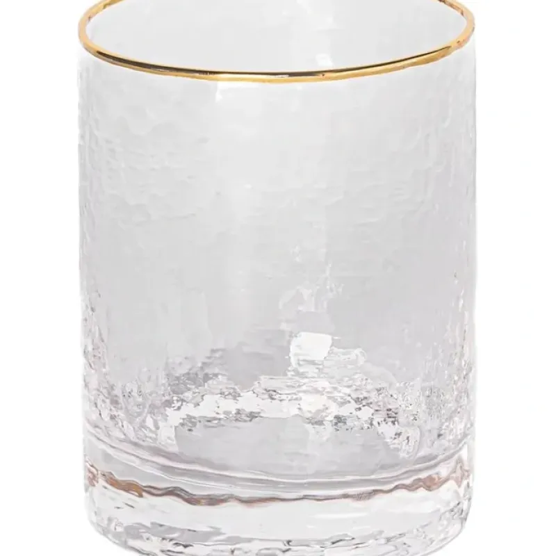 Jazz up cocktail hour with this fancy old fashioned glass; Features a hammered texture with gold rimMade from a high quality glass material; Recommended hand wash for longevityHolds up to approximately 12 ounces; Glass measures approximately 3.5 x 3.75 inchesPerfect for day or night drinking with your gals on the porch. around the pool and at the neighborhood BBQContained in protective packaging; Ready for easy gifting for a birthday. holiday. housewarming. or Christmas celebration