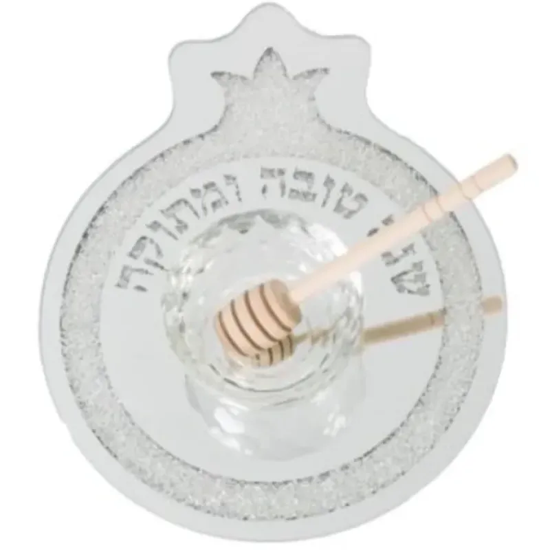NK42360453168 Pomegranate Shaped Glass Plate For Serving An Apple In Honey With Honey Dish In The Middle 9×7.5″