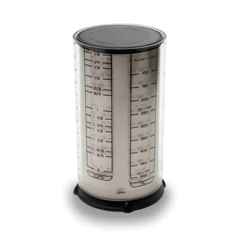 Are your kitchen drawers being taken over by different sizes of measuring cups? Declutter and free up storage with the Pro 2 Cup Adjust-A-Cup. This adjustable measuring cup measures metric or standard for liquids. dry and semi-solid ingredients. like honey. peanut butter. shortening. and butter. Its convenient pint. cup. ounce. and millimeter markings make doubling and conversions a breeze. To use. simply pull the plunger down to the measurement indicated and add your ingredient. Constructed of durable ABS and SAN plastic and silicone. this unique measuring tool features an award winning design with patented features and comes in a beautiful champagne satin finish. For best results. hand wash the Adjust-A-Cup with a sponge and warm soapy water. Stop juggling multiple sizes of measuring utensils. reduce your collection. and witness the space-saving functionality of this useful. yet elegant tool.