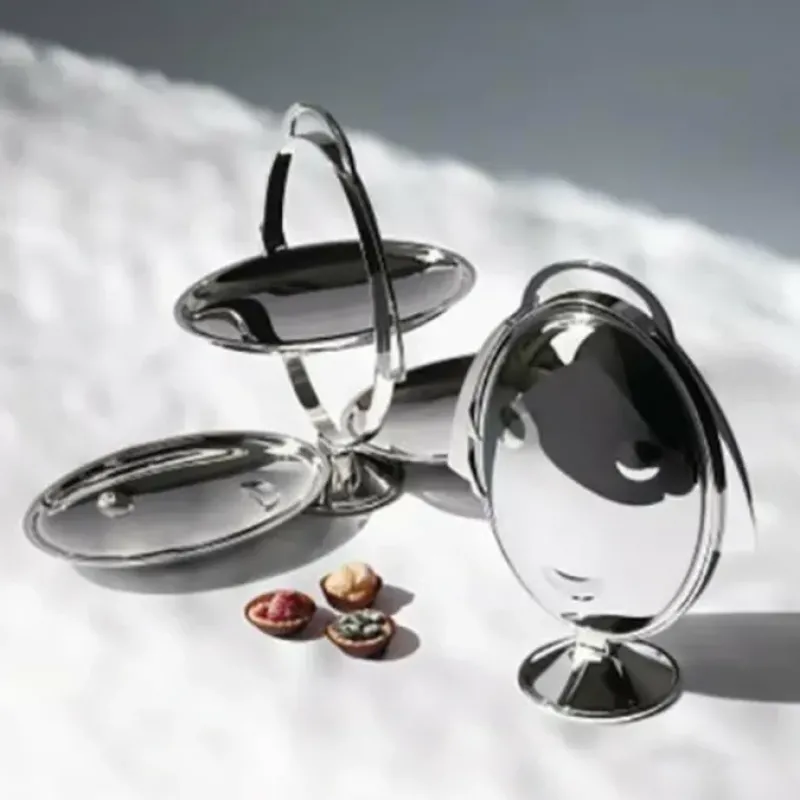 With his eternal muse. Anna. at his side. Alessandro Mendini has designed the Alessi Anna Gong Folding Cake Stand in tribute to the classic 1960s Alessi folding cake stand design. “art.898.” Folded away. Anna smiles sweetly. ready to serve. When unfolded. she offers three tiered surfaces to display cakes or other treats in gleaming style.