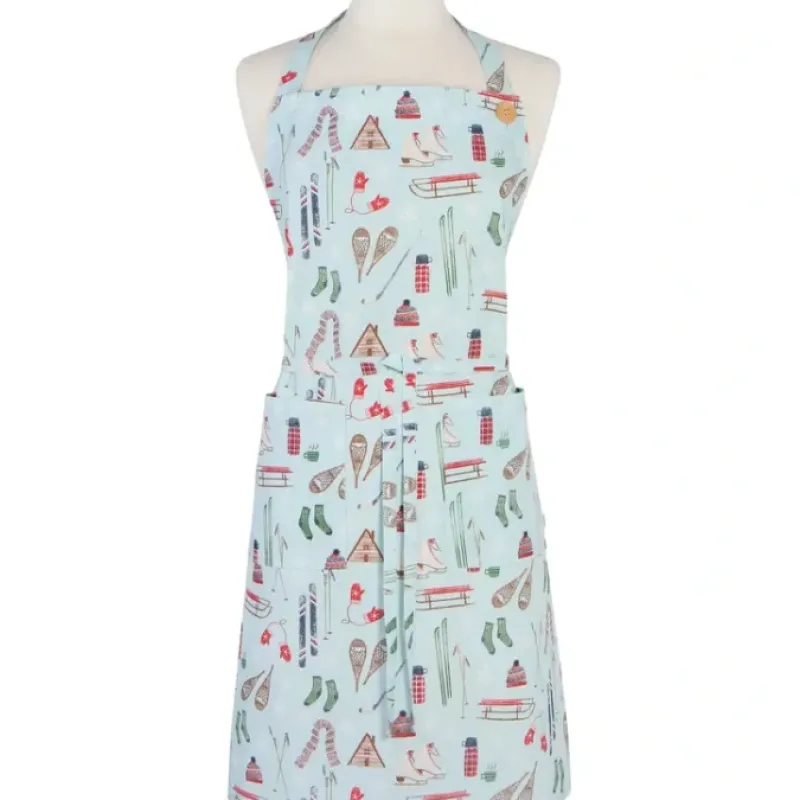 A soft cotton apron is paired with extra long waist ties and a wooden button closure for function and charm.