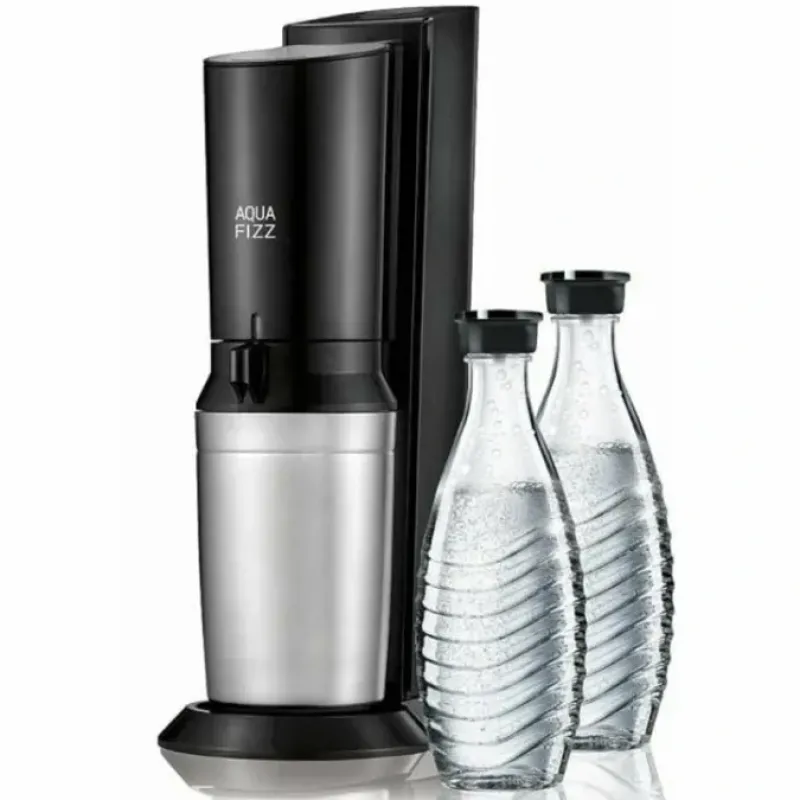 This innovative machine creates sparkling water directly in the two included glass carafes for a lovely presentation on dining tables and nightstands. Place one of the bottles into place. close the machine. then press the button your preferred number of times for the perfect level of carbonation—no electricity or batteries needed. The sleek black machine and clear glass bottles with black lids are slim and attractive for easy storage on the countertop and in the fridge. Bubble 60 liters of water using the included carbonating gas cylinder.