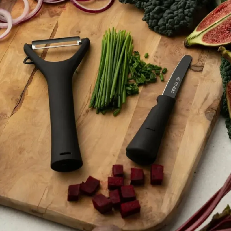 The extra sharp pivot blade peeler is made from stainless steel with the added feature of a potato eye remover. Both tools feature soft touch handles for optimum grip and comfort.