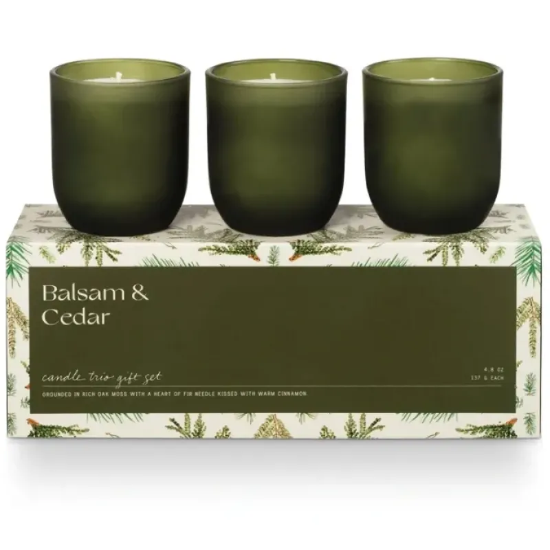 Three frosted glass candles sit inside a beautiful box with hand painted art and pops of gold foil.