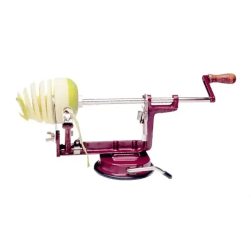 Red enamel-coated cast iron with stainless steel fork. heavy plated chrome shaft. and wooden handleSuction baseAdjustable peeling bladeEasily peels. cores. and slicesGreat for apples. potatoes. and moreDescriptionQuickly and easily prepare for apple pies. cobbler. and applesauce with the Back to Basics Peel Away apple peeler. Made from red enamel-coated cast iron. it has a stainless steel fork. heavy plated chrome shaft. wooden handle and a suction base that adheres to any smooth surface. This labor-saving apple peeler makes it possible to prepare homemade desserts in a jiffy. The Peel Away will peel. core. or slice with just the turn of the crank. It is also great for peeling potatoes and creating shoestring fries. Measurements: 12-1/2″ L x 5″ W x 5-1/2″ H