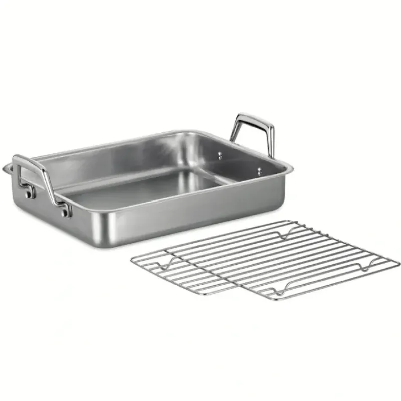The Prima Roasting Pan from Tramontina”s Gourmet Collection makes it easier to achieve roasting perfection. including succulent meat roasts that are tender inside and beautifully browned on the outside. Made of heavy-gauge 18/10 stainless steel. the 13.5 in Prima Roasting Pan comes with a basting grill that allows you to elevate your roast or bird to facilitate basting and allow drippings to fall into the pan below. The pan can also be used for roasting large whole fish. Large cast stainless steel handles provide a comfortable. balanced grip making it easier to carry. Handles are secured with heavy-duty solid stainless steel rivets to accentuate the professional-grade construction.
