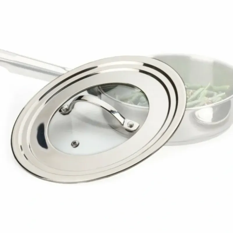 Constructed of heavy gauge 18/8 stainless steel with a tempered glass insert with steam vent and riveted handle.