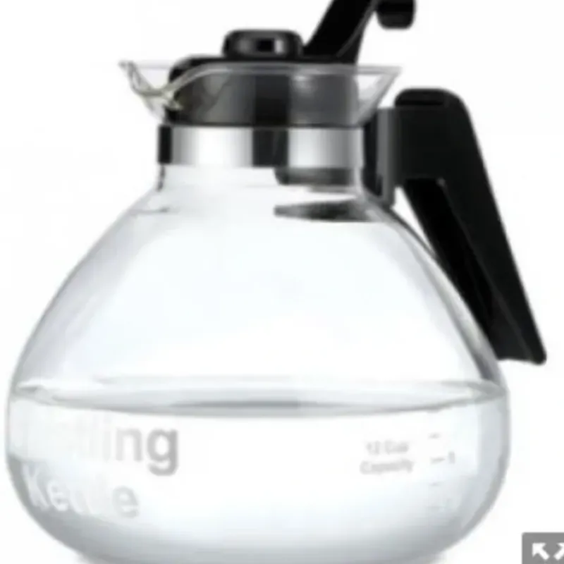 12 cup. glass stove top whistling kettle. heat tolerant handle. made of phenolic plastic. can withstand very high temperatures. borosilicate glass body is heat tolerant and can be used on gas and electric stove tops. replacement carafe for bunn pour-a-matic coffee makers with lid removed.