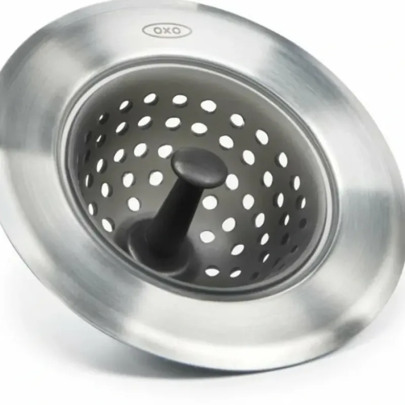 The OXO Good Grips Silicone Sink Strainer combines sleek stainless steel with flexible. stain-resistant silicone. The easy-to-clean silicone basket traps food debris to prevent clogs. When its time to empty your Strainer. simply pick it up by the center post and invert the silicone basket for easy debris removal. A silicone underside wont scratch the sink basin.