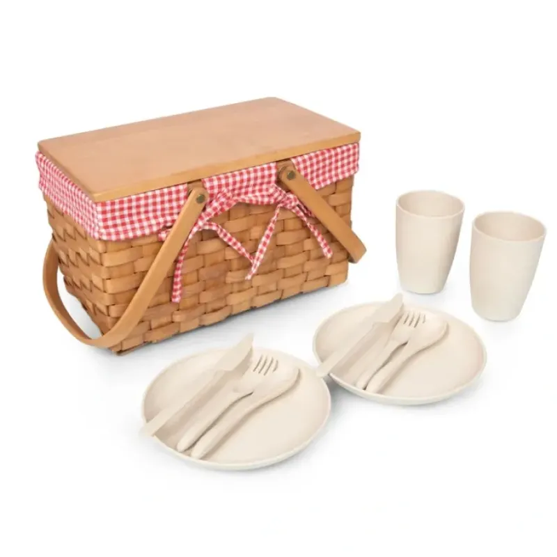 Imagine your little ones playing picnic with friends with this timeless. handwoven basket: perfectly sized. with bamboo plates. cups and utensils for two.
