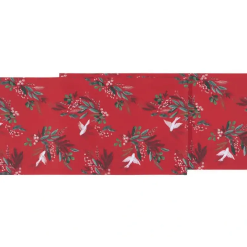 Doves flutter amongst boughs of winter greenery and berries. Sprigs of pine. cedar and eucalyptus sweep against a crimson red background.