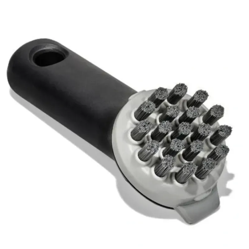 Our OXO Outdoor Cast Iron Brush is tough enough to tackle cast iron and carbon steel cookware. yet gentle enough for cleaning all your non-stick pots and pan. No need for soap or detergent so you can feel confident the seasoned surface of your cast iron and carbon steel will be protected. This specialty brush has a thoughtful bristle pattern designed to clean flat and ridged cookware. while the angled bristle design adds leverage so you can clean tough-to-reach grooves. A tough scraper helps get rid of those stubborn. greasy messes. while a compact. non-slip handle provides a comfortable grip. Dishwasher safe. Not suited for use with hot grills.
