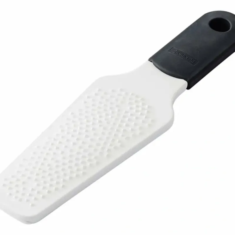 Our traditional ginger grater designed into a classic kitchen grating tool. This award-winning handheld grater is made from an advanced ceramic close in hardness to diamond and will make any grating task easy. With rows of long-lasting sharp teeth. roots such as ginger are quickly shredded. leaving the unwanted fiber behind. Also great for elephant garlic. daikon radish. and parmesan cheese. For ease of use. non-slip silicone base underneath holds the grater in place.