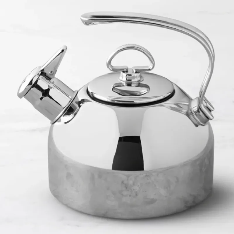 When water comes to a boil. this teakettle’s Hohner harmonica whistle sounds off with all the resonance of a train whistle. The kettle’s flat base promotes fast heating while the wire-loop handle provides a secure grip. Designed by Chantal Founder. Heida Thurlow. nearly 40 years ago and has become an icon of teakettle design and function. Ms. Thurlow has the distinction of being the first woman in the U.S. to launch and run a cookware company and continues to do so today.