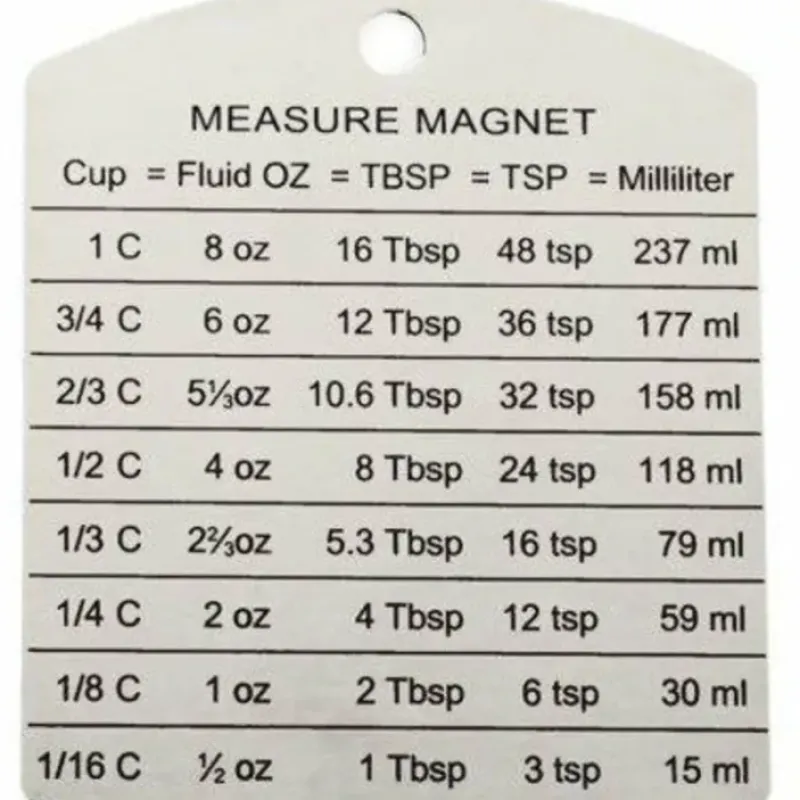 The RSVP Measuring Magnet Chart gives you convenient access to conversions of cup measurements to their equivalents in fluid ounces. tablespoons. teaspoons and milliliters. A great tool for cooks andbakers this measuring chart is made of durable stainless steel with bold black lettering for easy reading.