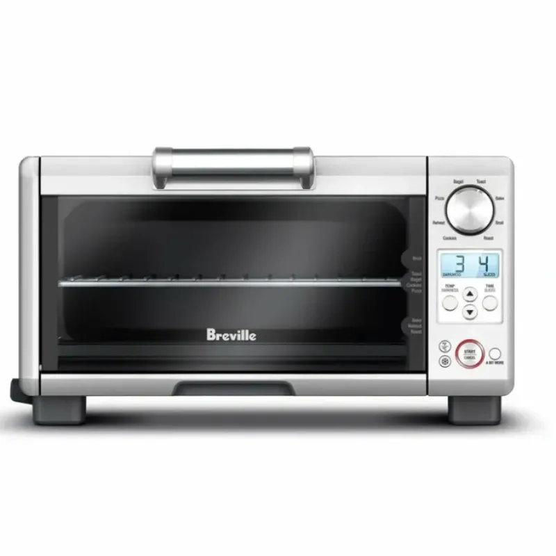The Mini Smart Oven features 8 preset functions that simplify everything from toasting. broiling. baking. roasting. cookies and reheating. Toasts up to 4 slices of bread and accommodates up to an 11″ pizza. Element IQ automatically adjusts heat and calculates cooking times. ‘A Bit More’ button adds additional time without the need to reset the cooking time. The easy to read LCD display changes color to let you know when the oven is heating. Pull-out crumb tray can be removed from the front for easy cleaning. Includes a 10’x 10″ enamel baking pan.