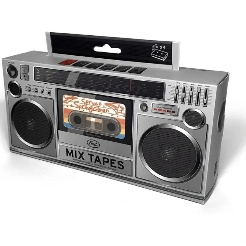 - FUN FUNCTIONAL: Don’t get wound up about doing the dishes! Fred’s Mix Tapes sponges will help you face the music and get those dishes sparkling clean! This clever sponge set includes 4 cassette sponges. each with a puny mix tape name!