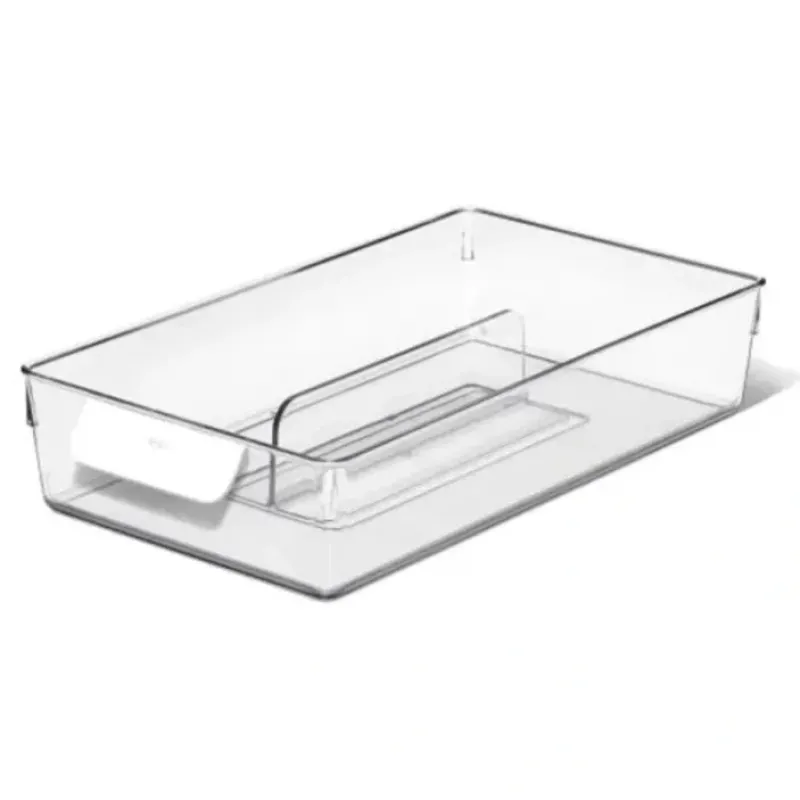 The OXO Good Grips Fridge Organization System is an extensive collection of bins. drawers. shelves. risers and accessories to help streamline your refrigerator. The clear. space-saving adjustable storage Bin design provides a visually pleasing way to keep food from getting lost and helps prevent food waste. The rounded handles provide a comfortable grip. while the removable divider adapts to your storage needs. A smooth base allows the bin to glide easily so you can keep an eye on food expiration dates.