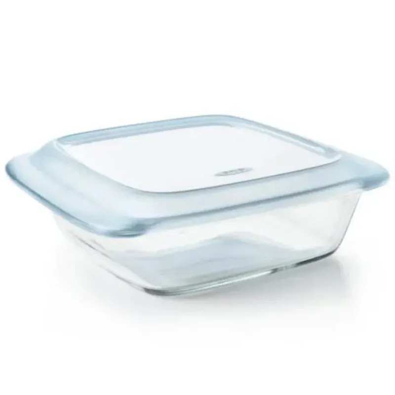 The OXO Good Grips 2 Qt Glass Baking Dish is made of durable borosilicate glass. which can withstand extreme temperature changes without breaking or shattering. This means the Dish can go directly from the refrigerator or freezer—no need to spend time thawing—to a preheated oven without breaking. The Dish is imprinted with dimension markings (2 qt/1.9 L; 8-in x 8.5-in x 2.4-in / 20-cm x 21-cm x 6-cm) so you can be sure you have the right size for your recipe. It won’t stain or absorb odors. and it’s easy to clean. It has generous handles. so it’s easy to grip and move. Microwave-safe. dishwasher-safe. freezer-safe and BPA-free. Product is not intended for use under a broiler.