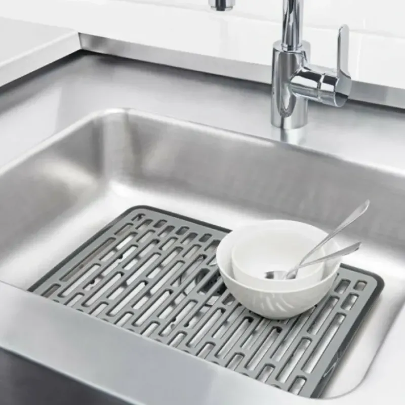OXO Good Grips Sink Mat protects your dishes from scratching or chipping. while allowing water to flow through easily. Non-slip silicone feet keeps mat securely in place and lifts it up for a quick and thorough drying. 2 sizes available. Mold-resistant.