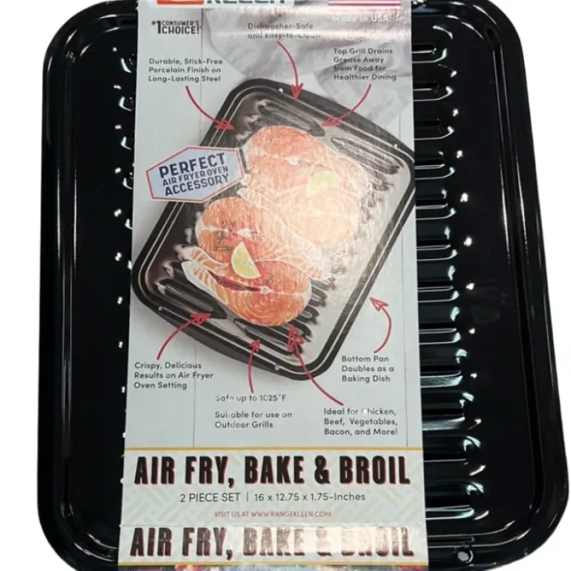 This pan does it all. It is the perfect full-size air fryer oven accessory. Use the top grate for crispy results or the top grate and bottom pan together to catch any drippings. Baked crispy bacon never tasted so good. and the grease drains away from the bacon as it bakes. The top grate is perfect for delicate items on your outdoor grill too! Delicious vegetables. shrimp. and grilled fruit. whatever food can easily fall through the grates. can now be grilled easily on your outdoor grill. Want to grill dinner. but it is not the best weather outside? Our Broiler Pan is the perfect pan for grilled goodness under your broiler setting in the oven. The bottom pan is the perfect baking pan for sheet cakes. brownies. casseroles. or focaccia. The heavy-duty porcelain is easy to clean and stick-free.