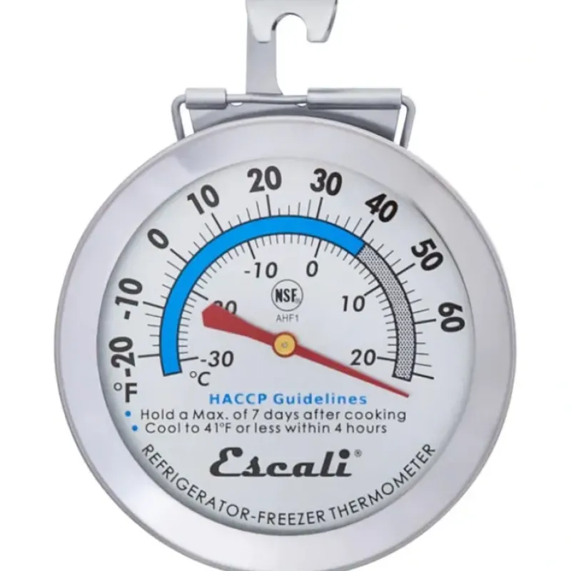 The Escali AHF1 Refrigerator / Freezer Dial Thermometer will help you monitor air temperatures in cold storage environments to maintain food safety. The safe air temperature zone for cold storage is indicated on the dial face as well as related HACCP food safety tips. The durable stainless-steel design is NSF certified and easy to clean.