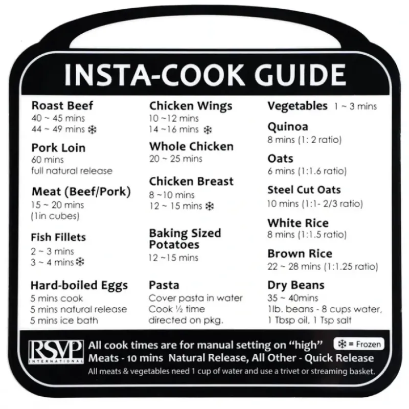 - Reference this guide for the proper times and ratios to cook your food for a perfectly instant-cooked meal every time.