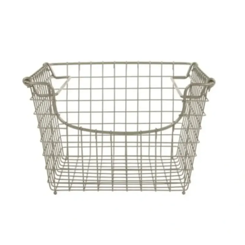 Storage Doubles as Decor: The wire is stylishly thin. yet sturdy; it can hold heavy canned goods or candles without problem. but the lightweight design creates a modern look. Wrapped wire ends and grid designs create a popular rustic look that will complement farmhouse-style homes.Raised Base: Protect your produce. towels. toys. and more from spills and stains. Raised feet keep the base of the basket off countertops and freezer floors. protecting the contents from spills or leaks. Keep towels off potentially wet bathroom counters and floors. and protect cleaning supplies from utility or laundry room spills.Dimensions and Care: Measures 13″ L x 13″ W x 8.5″ H. To clean. wipe clean with a damp cloth and towel dry.