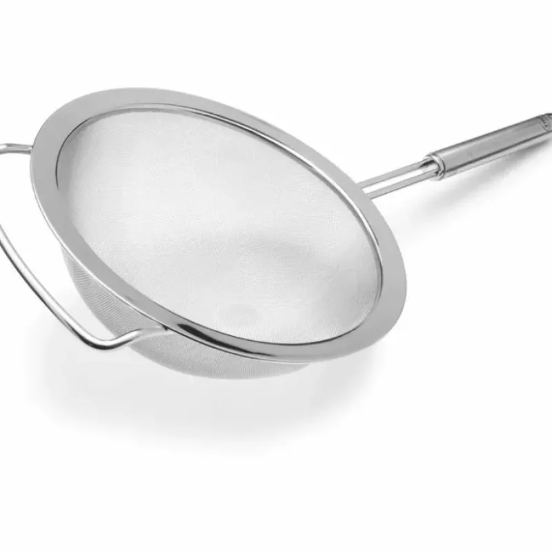 Fine-mesh strainer is perfect for blanching. straining vegetables. sifting flour. dusting cakes with powdered sugar. and much more. Extra handle hooks onto bowls or pans for stability and easy use. These sturdy strainers are made from non-corrosive 18/10 stainless steel. Round handle fits comfortably in the hand and features a loop on the end for convenient hanging storage and accessibility.