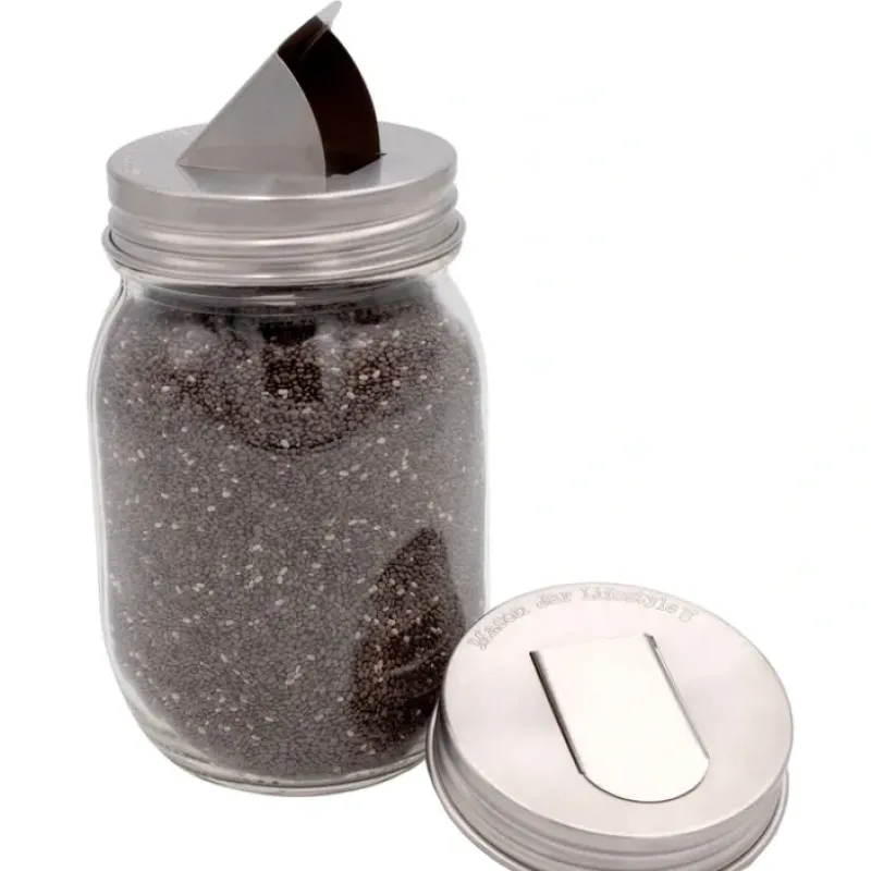 These old-timey grain dispensing lids allow you to easily store pourable powders. granules. candies. nuts. or small pet treats in any Mason jar. Not airtight. does not seal.Two lids per box.This vintage-style. rust proof. stainless steel lid is the perfect mason jar accessory for storing grains and other pourable items in your home. Ditch the plastic!Also great for storing powdered dish and laundry detergents.Not airtight – there is a gap where it closes.Jars sold separately.