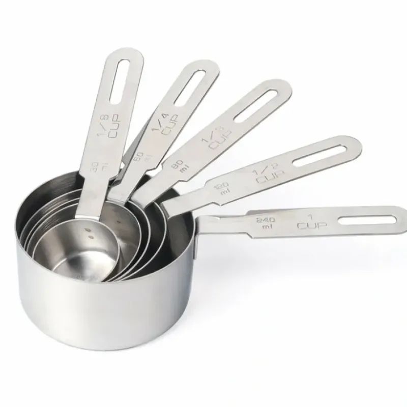- EXACT MEASUREMENTS: Measurements are permanently stamped in US and Metric capacities onto the comfortable. slightly rounded 4 inch long handles. Stamped measurements are preferred as they will not fade from continuous use or after washing.