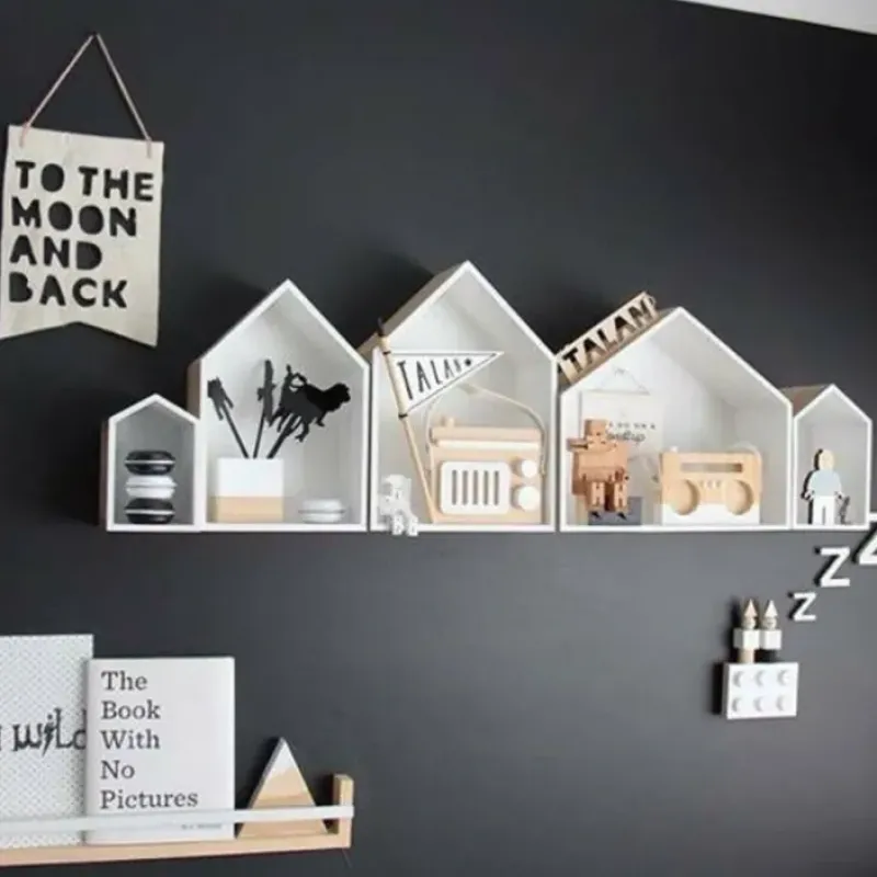These shelves are a fun way to display books. plants. toys and ornaments on your wall.