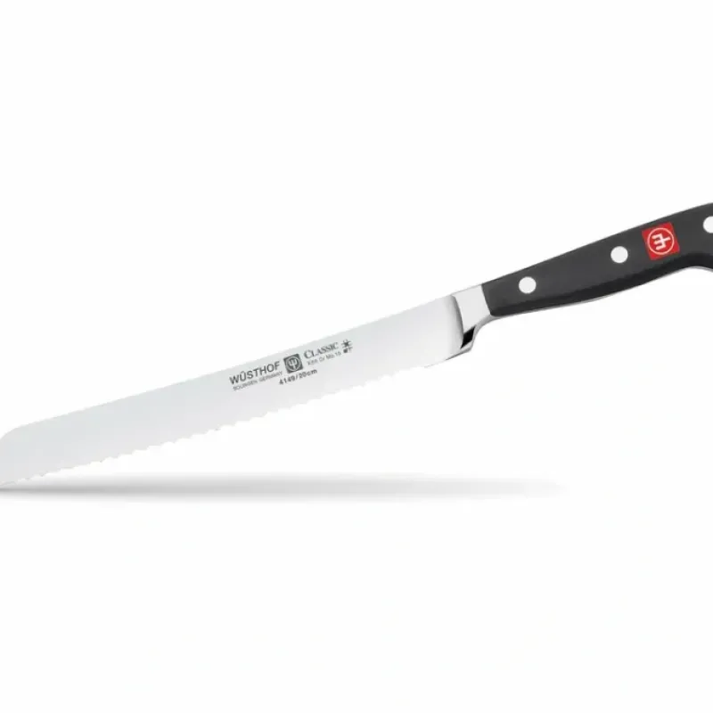 WSTHOF’S best-selling collection for generations. CLASSIC full-tang knives are precision-forged from a single piece of an exclusive high-carbon stainless steel. CLASSIC knives feature a new handle design made of a highly durable synthetic material – Polyoxymethylene (POM) – which has a tighter molecular structure to resist fading and discoloration. The CLASSIC 8″ Bread Knife slices through bread or baguettes with minimal crumbs. The serrations along the edge help guide the blade through tough crust without compressing the soft inside.