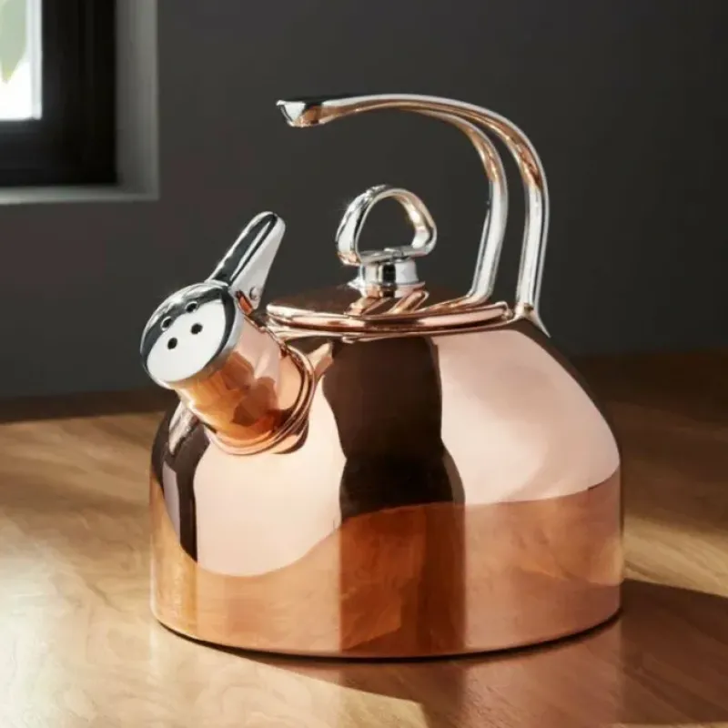 Now in elegant copper. this timeless Chantal kettle is an icon of good design and durability. Perfect for all stovetops. including magnetic induction. this classic kettle has a smooth. flat base for rapid boiling and an exclusive two-tone harmonica whistle. The shiny copper finish will darken over time. developing a rich patina. To restore it to its original color. simple dissolve 1 tablespoon of salt in 1/4 cup of vinegar and apply the solution to a small area of the kettle and rinse quickly under running water. Continue until the entire kettle is shiny.