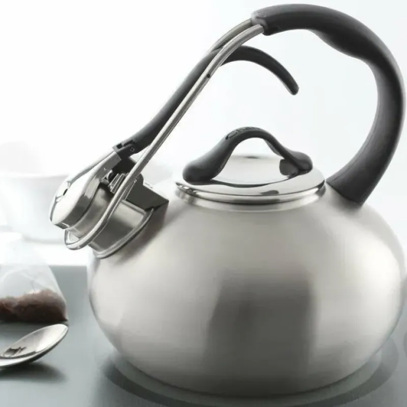 This elegant and contemporary tea kettle looks fantastic on the stovetop. Crafted of heavy-gauge stainless steel with a red enamel finish. this kettle has a unique handle that artfully arches from spout to body in one sculptural loop with a trigger pull for pouring. Its pleasant whistle let’s you know it’s tea time.